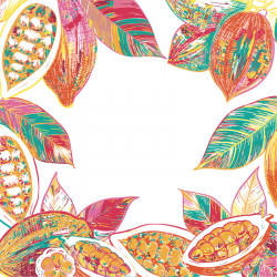 Jolie collection de Packaging au motif original, mêlant végétal et cabosses de cacao dans des tons blanc, vert et orange.
