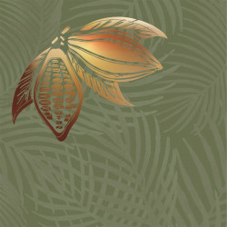 Magnifique collection de packagings avec illustration représentant des cabosses de cacao aux éclats cuivrés sur papier végétal.